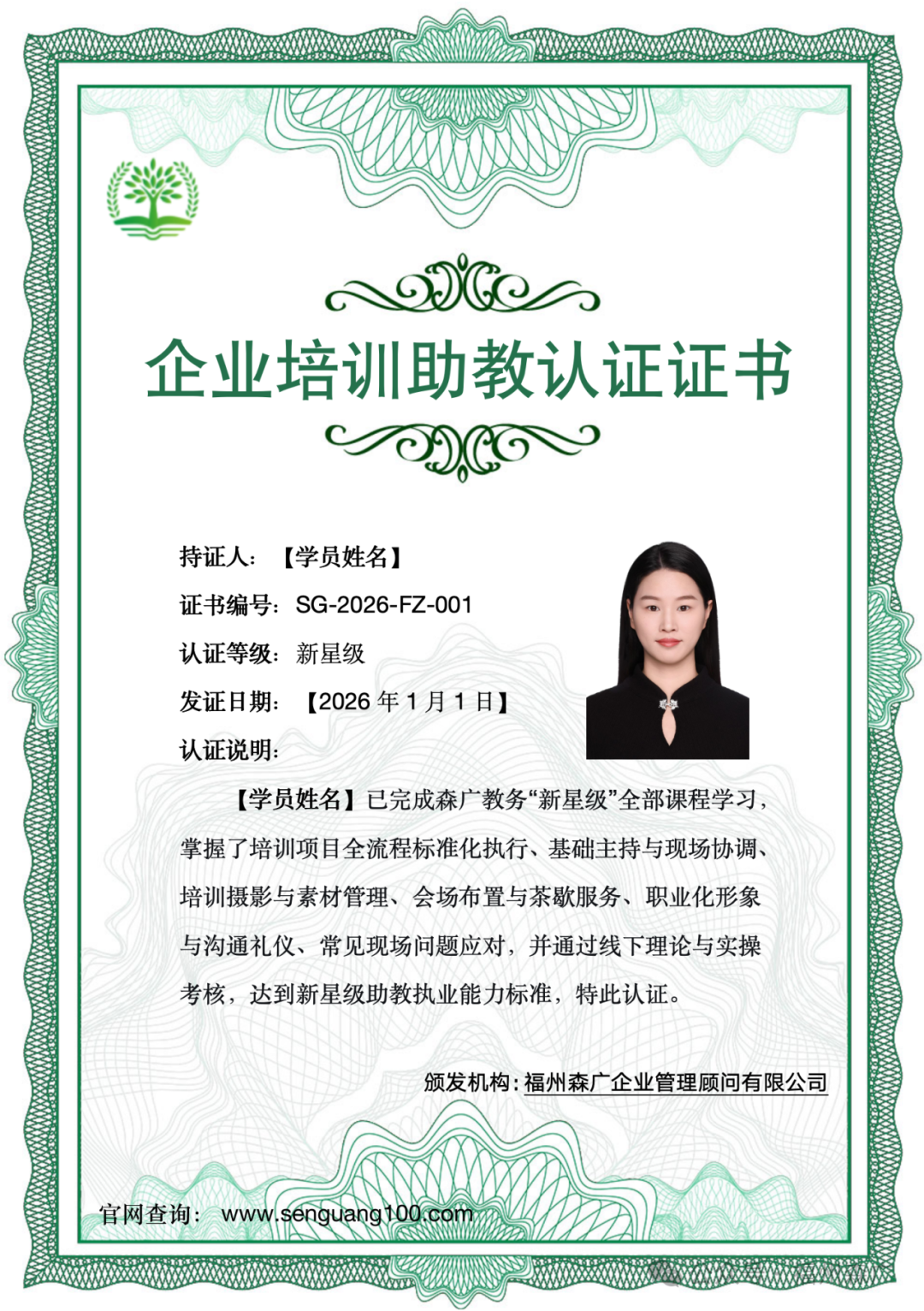 学员通过严格的理论学习与实操考核后,将获颁森广教务认证的《企业培训助教认证(新星级)证书》。该证书配有唯一编号,可通过森广教务官方网站查验真伪,是助教系统化学习和专业执行能力的有效证明。